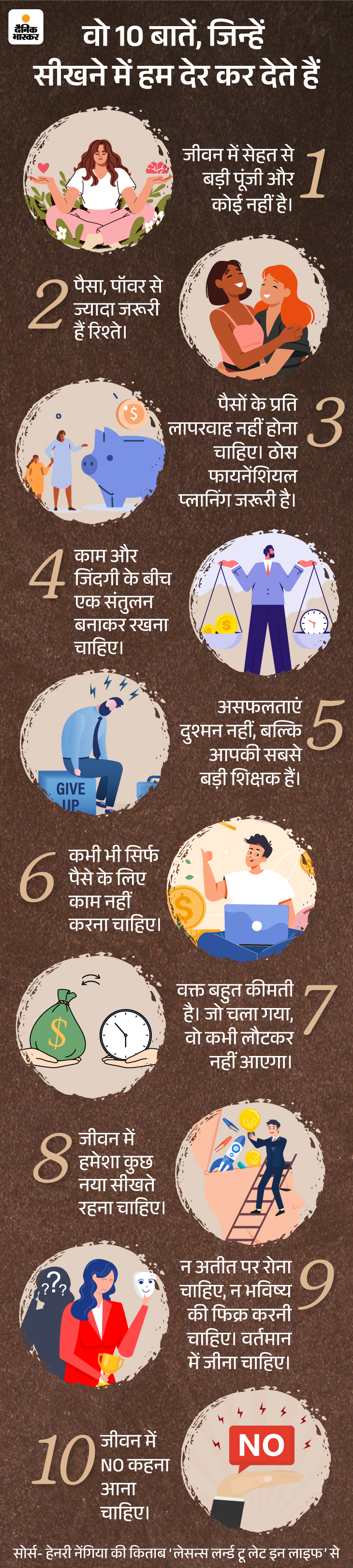 हेनरी नैंगिया ने अपनी किताब ‘लेसन्स लर्न्ड टू लेट इन लाइफ’ में उन बातों के बारे में जिक्र किया है जो हम जीवन में देर में समझ पाते हैं जैसे कीमती वक्त यूंही बर्बाद न करना, स्वास्थय पर भी उतना ही ध्यान देना जितना पैसा कमाने में देते हैं। वहीं इस किताब में व्यक्तिगत विकास के बारे में जोर दिया गया है।
