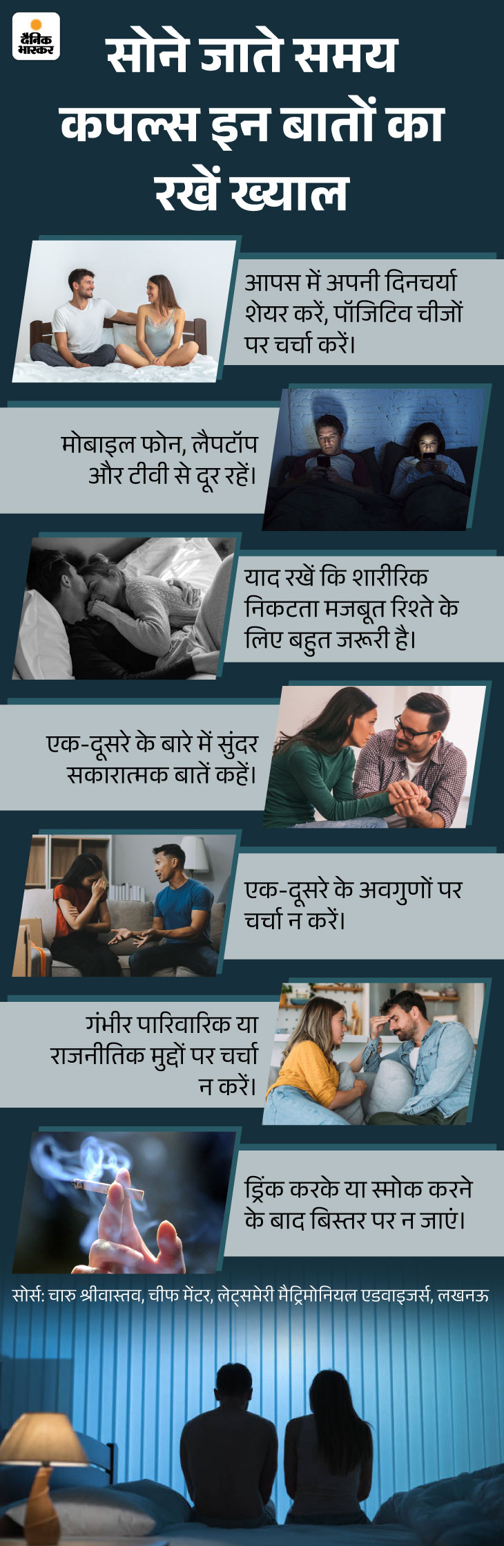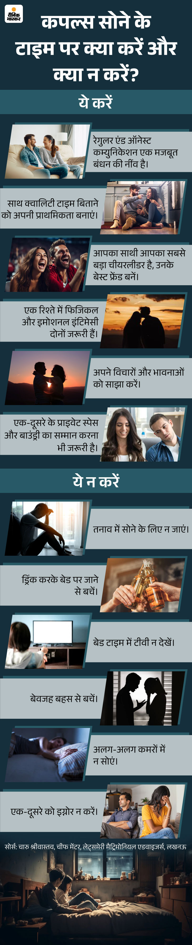 दिन भर की थकान के बाद अगर सोते समय सुकून और प्यार का अहसास न मिले, तो कपल धीरे-धीरे कई गंभीर बीमारियों का शिकार भी हो सकते हैं। जैसेकि डिप्रेशन, एंग्जाइटी, स्ट्रेस आदि। ऐसे में ये जानना महत्वपूर्ण है कि बेड टाइम पर क्या करें और क्या न करें। नीचे दिए गए ग्राफिक के जरिए इस बारे में जानें।