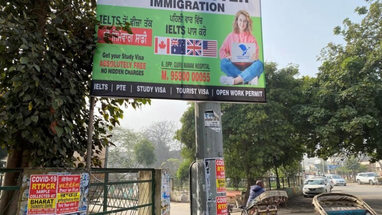 A poster of an immigration consulting agency in Rajpura town amid rising emigration in Punjab. | Photo Credit: REUTERS Uncertain over securing a suitable job,