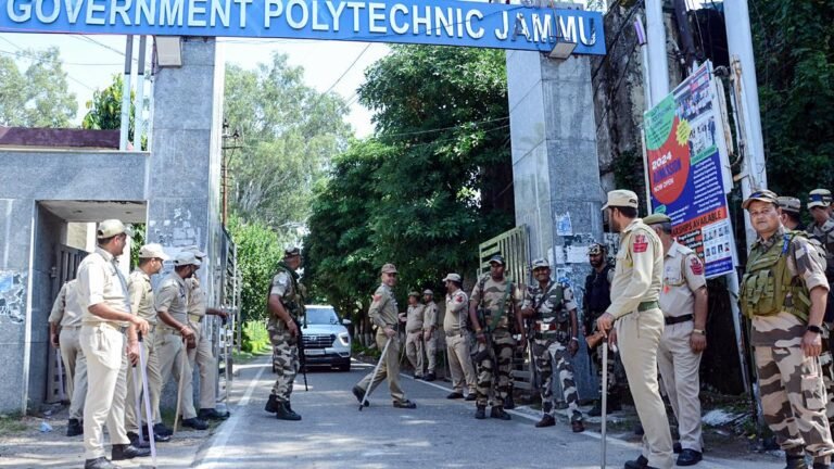 Security personnel stand guard ahead of the counting of the Jammu and Kashmir Assembly elections, at Polytechnic College in Jammu on Monday. | Photo Credit: