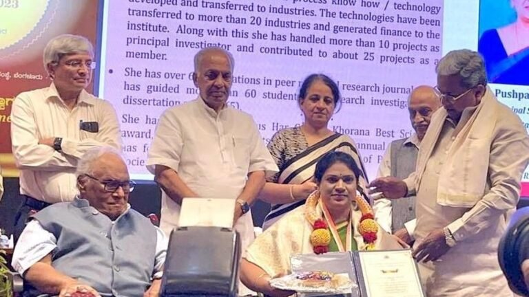 CSIR-CFTRI scientist Pushpa S. Murthy receiving Dr. Kalpana Chawla award from Chief Minister Siddaramaiah in Bengaluru recently. Bharat Ratna renowned scientist C.N.R. Rao and other