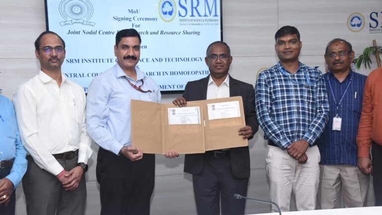 Representatives of SRMIST and Central Council for Research in Homoeopathy signing an MoU on Tuesday. | Photo Credit: Special arrangement The Central Council for Research