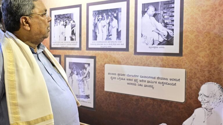 Karnataka Chief Minister Siddaramaiah at the pictorial exhibition on the life of the former Chief Minister D. Devaraj Urs at the Vidhana Soudha in Bengaluru