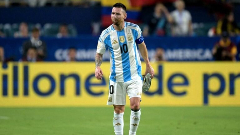 Argentina’s Lionel Messi leaves the pitch after picking up an injury during the Conmebol 2024 Copa America tournament final football match between Argentina and Colombia