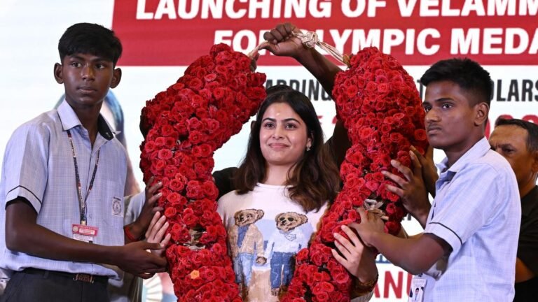 Manu Bhaker being welcomed with a huge rose garland at the Velammal Nexus School in Chennai on Tuesday. | Photo Credit: R. RAGU Manu Bhaker