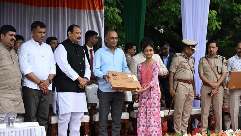 Top-scoring class 10 students from government schools in Dakshina Kannada district were given laptops by Health Minister Dinesh Gundu Rao during the Independence Day programme