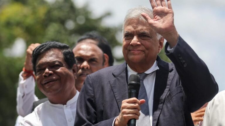 President Ranil Wickremesinghe addresses his supporters after submitting his nomination papers for the upcoming presidential election, scheduled for September 21, in Colombo, Sri Lanka, on