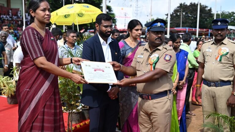 Collector R. Brinda Devi presents a certificate of appreciation to police personnel during the 78th Independence Day celebrations at Mahatma Gandhi Stadium in Salem on