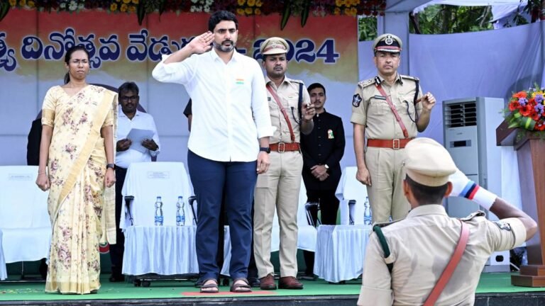 Minister for HRD N. Lokesh during the 78th Independence Day celebrations in Guntur on Thursday. | Photo Credit: T. VIJAY KUMAR No beneficiary will