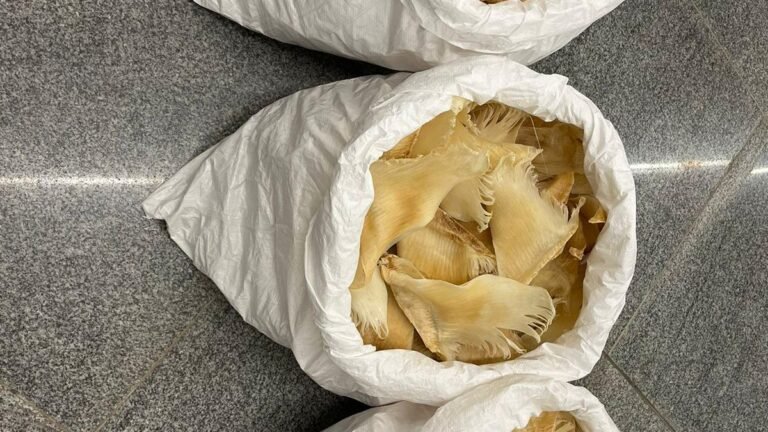 Shark fins seized by the Air Intelligence Unit officers at Tiruchi international airport on Wednesday. | Photo Credit: Special Arrangement Officers of the Directorate of