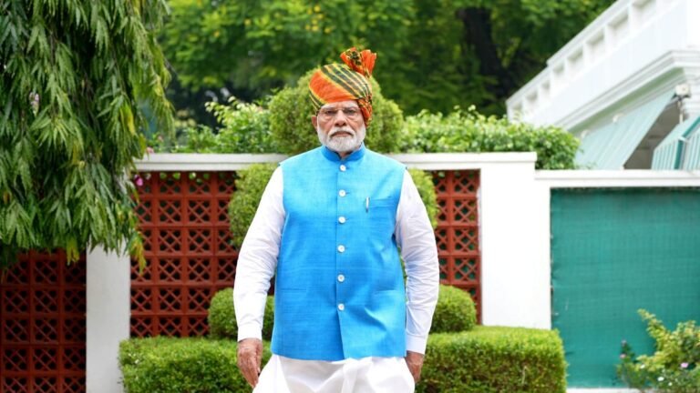 Prime Minister Narendra Modi leaves from his residence to attend the 78th Independence Day celebrations at the Red Fort, in New Delhi, Thursday, Aug. 15,