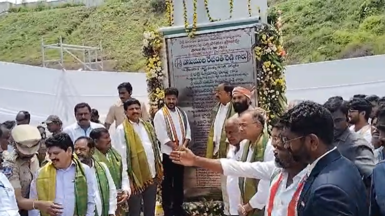 Telangana Chief Minister A Revanth Reddy unveils the pylon of the Sita Rama Lift Irrigation Project (SRLIP) before switching on the first pump of the
