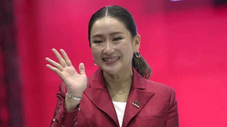 Leader of Pheu Thai Party, Paetongtarn Shinawatra, daughter of Thailand’s former Prime Minister Thaksin Shinawatra, reacts after her speech at the party headquarters in Bangkok,