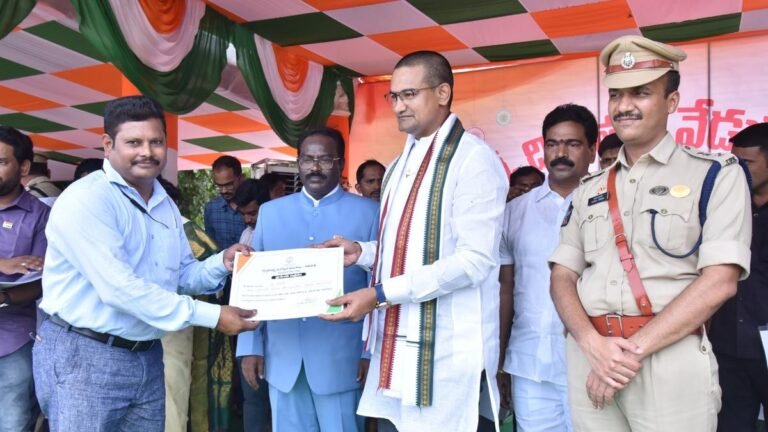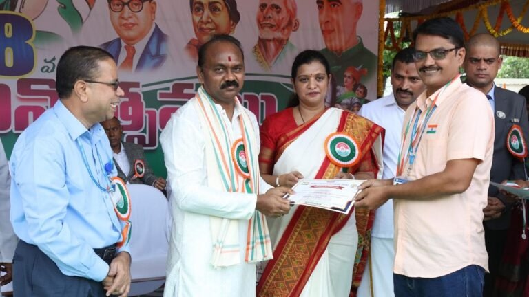 Minister Kondapalli Srinivas giving away the appreciation certificate to I&PR Assistant Director Dunna Ramesh in Vizianagaram on Thursday. | Photo Credit: SPECIAL ARRANGEMENT Minister for