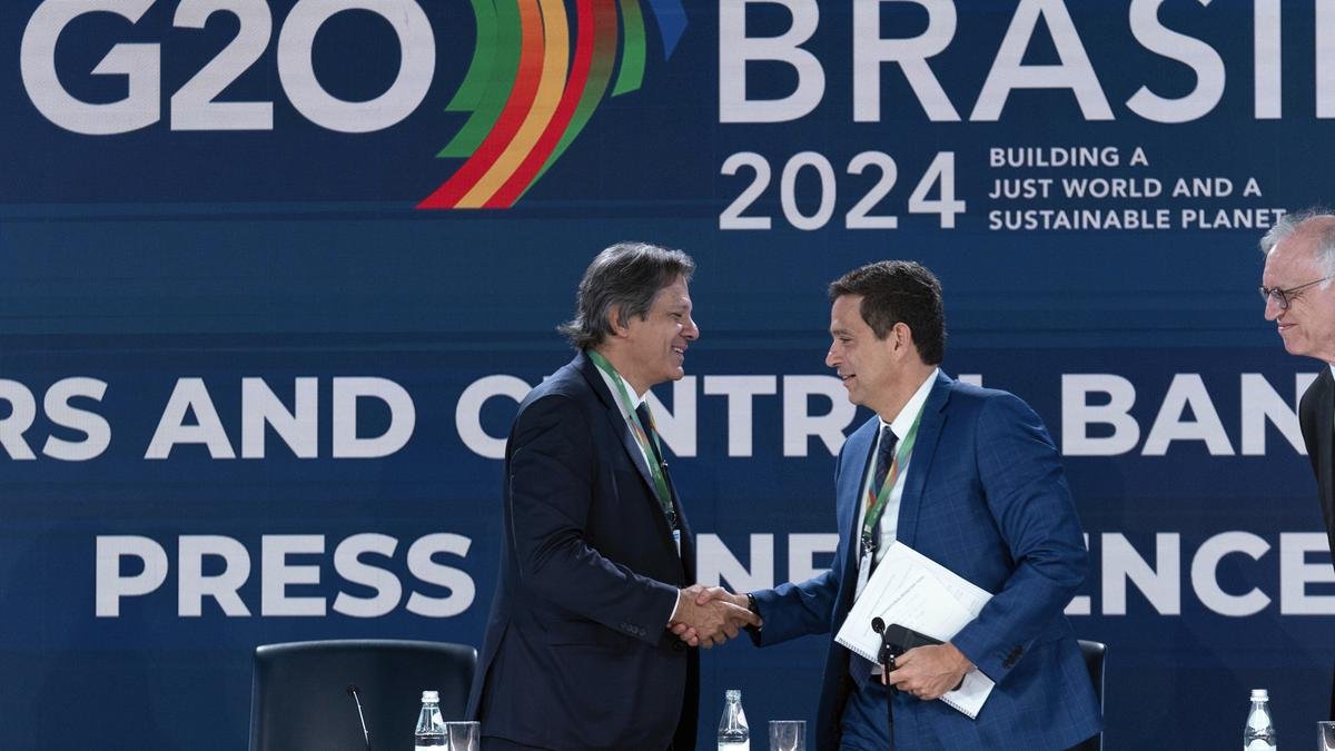 Brazil’s Finance Minister Fernando Haddad (left) and Central Bank Governor Roberto Campos Neto, shake hands during a G20 news conference at the World Bank/IMF Annual Meetings in Washington on Thursday (October 24, 2024).