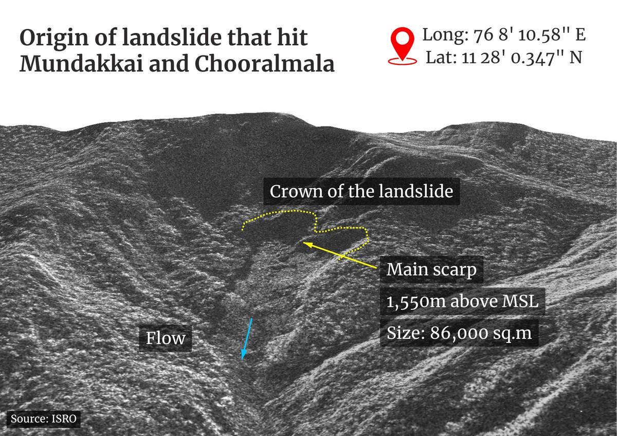 The origin of the landslide has been identified as a valley above Punchirimattom, near the Mundakkai region. According to the satellite imagery released by ISRO’s National Remote Sensing Centre (NRSC), the “crown of the landslide” or the origin is above 1,550m above Mean Sea Level (MSL) and the approximate size of the main scarp is 86,000 sq m — roughly equivalent to 12 football fields.